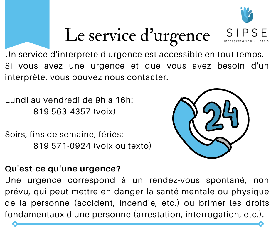 Il y a moins de disponibilités pour les interprètes, il est donc important de faire vos demandes le plus tôt possible. Ceci permet de laisser plus de temps à la répartition de trouver un ou une interprète pour les rendez-vous.